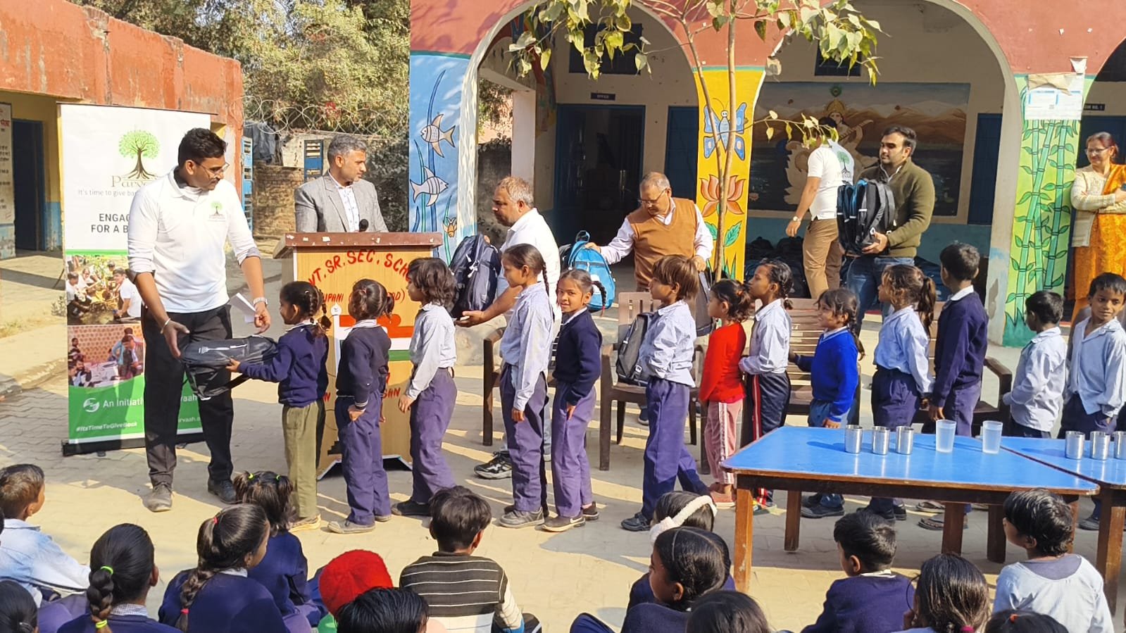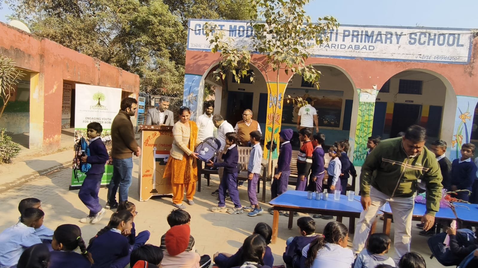 Keeping all these children in mind, Parvaah obtained a list of all students studying in the second shift at this school. Considering the students of the second shift, 350 primary-level students were provided with complete stationery kits by Parvaah. Each kit included a school bag, English, Hindi, and Mathematics notebooks, a drawing book, colors, and a geometry kit containing pencils, an eraser, a ruler, and a sharpener. All these items were distributed to the children.